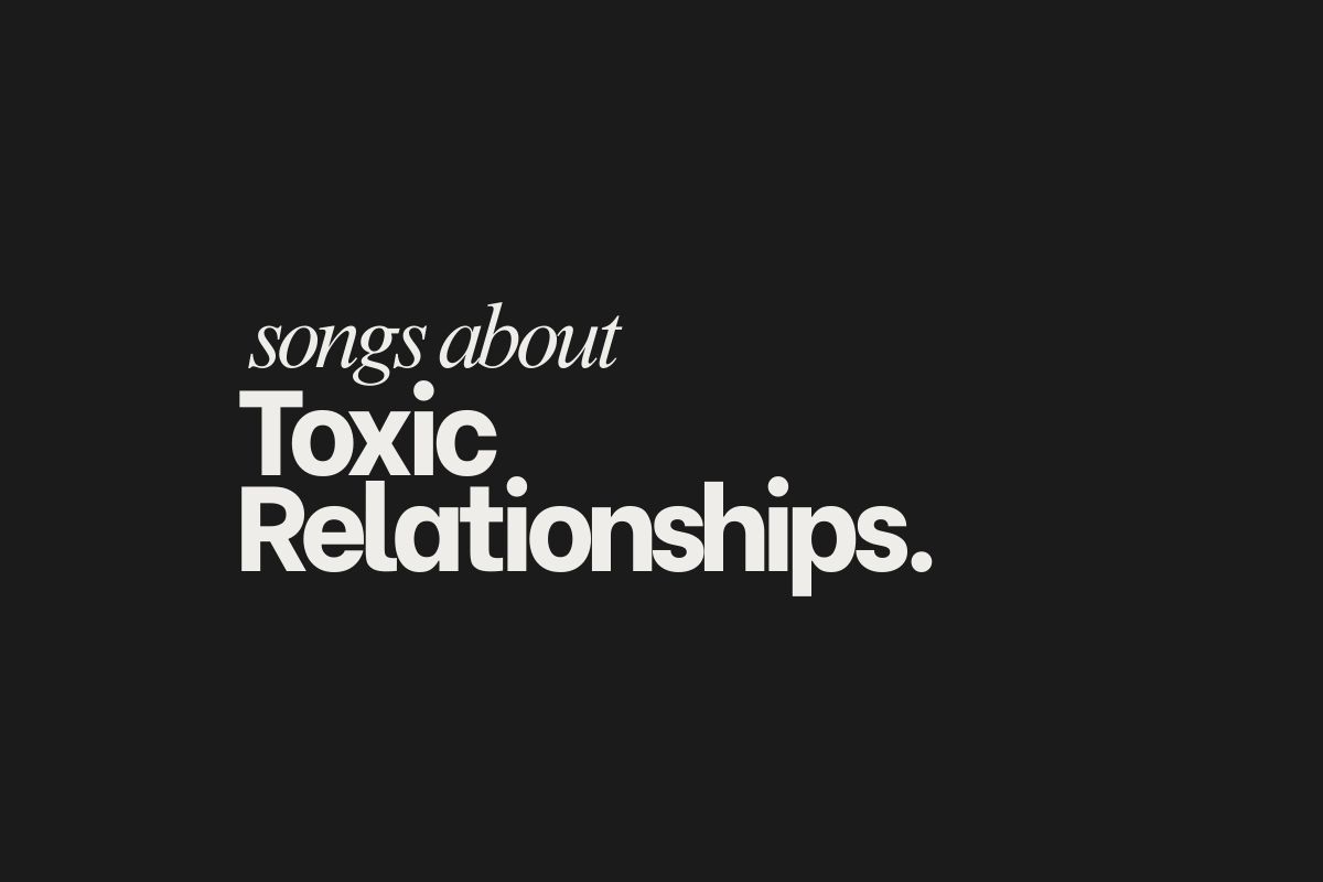 High-contrast graphic with a dark, textured background and white minimalist text that reads Songs about toxic relationships.